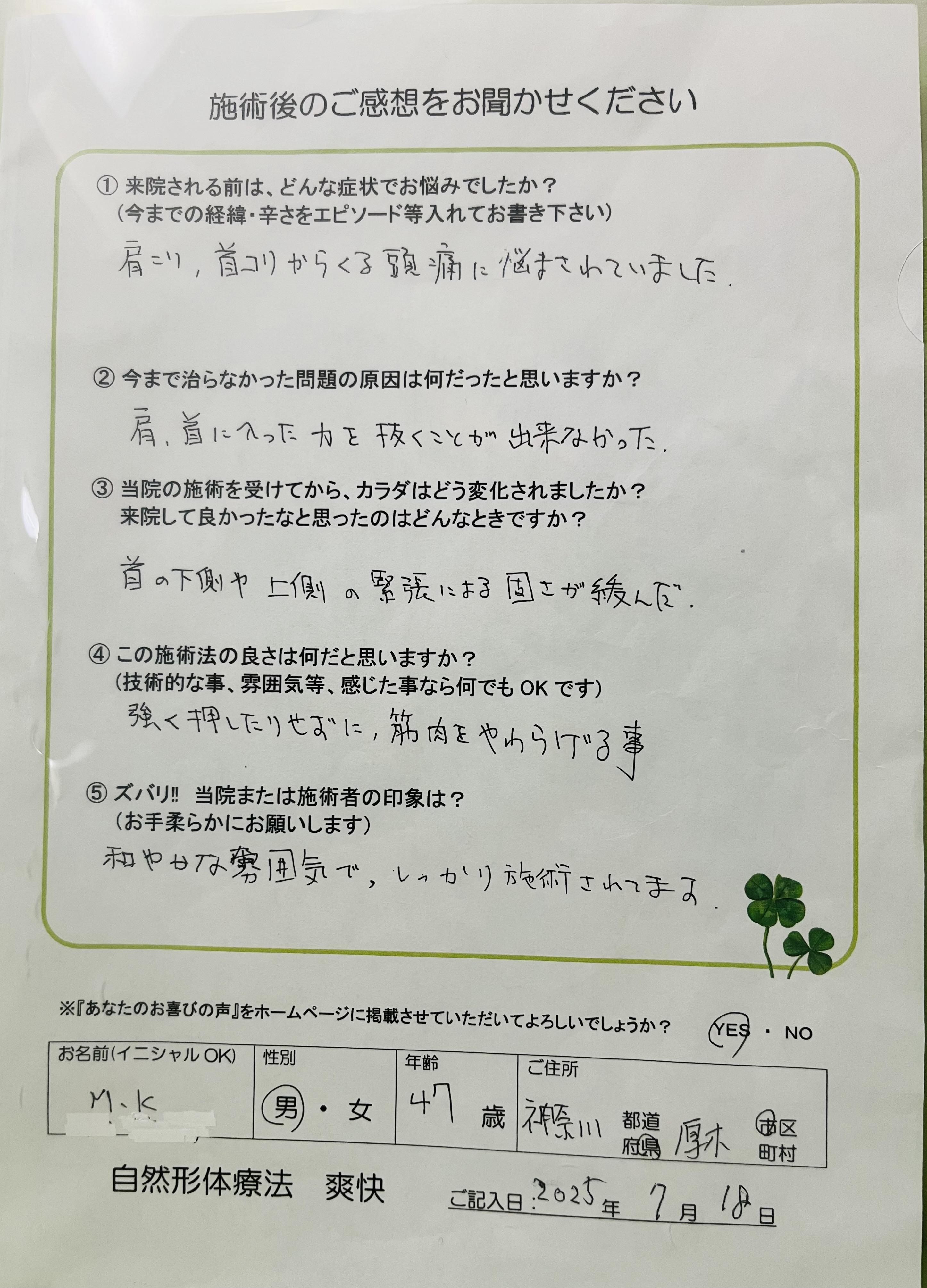 自然形体療法爽快には、慢性的な肩こり、腰痛で悩まされている方が多く来院されます。どこに行っても良くならない為、もう治らない!と半分諦めていた方も少なくありません。私自身も、小学校の頃から酷い肩こりや頭痛に悩まされ、この痛みとは一生付き合っていくのだろうと思っていました。しかし、今はそんな苦痛から解放され、快適な生活が送れるようになりました。